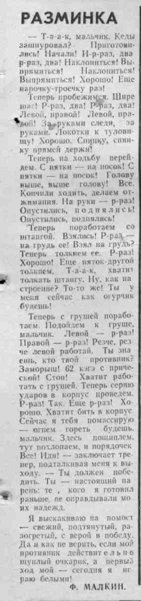 Малкин, Ф. Разминка / Ф. Малкин // Молодой ленинец. – 1979. – 31 марта. – С.3.