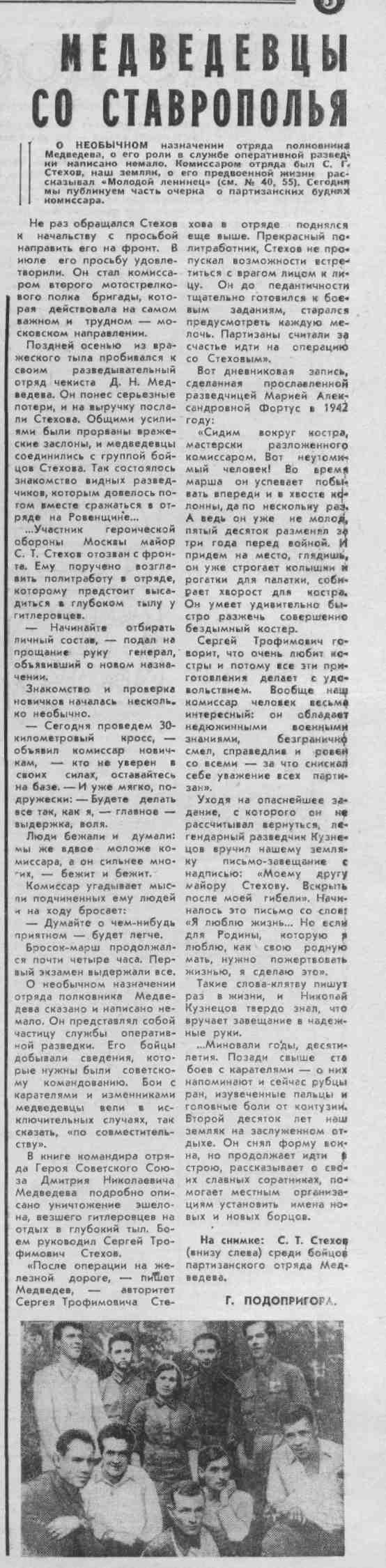 Подопригора, Г. Медведицы со Ставрополья / Г. Подопригора // Молодой ленинец. – 1979. – 6 апр. – С.3.