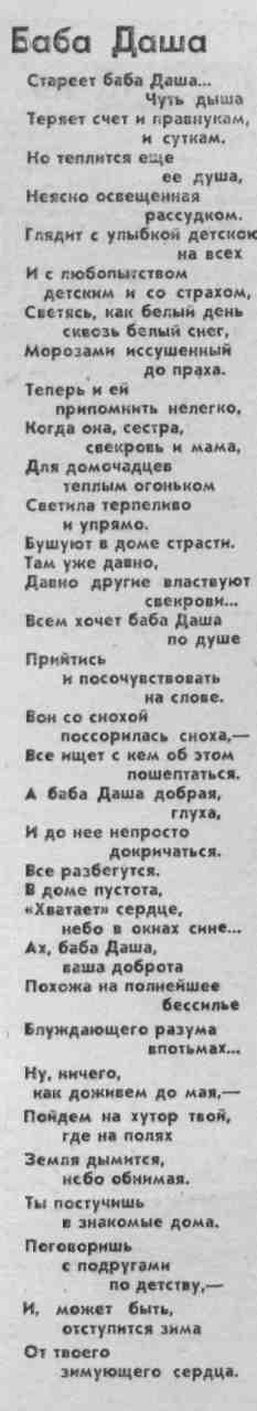 Котовская, Р. Баба Даша : [стихотворение] / Р. Котовская // Молодой ленинец. – 1979. – 7 апр. – С.3.