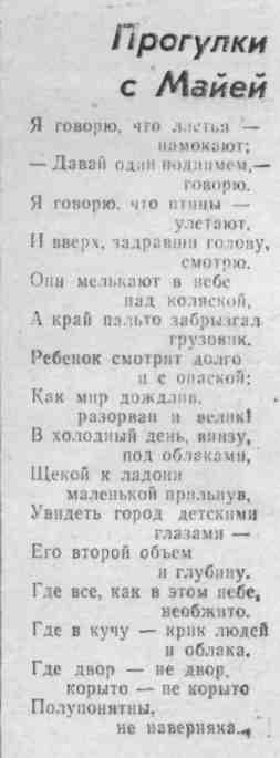 Котовская, Р. Прогулки с Майей : [стихотворение] / Р. Котовская // Молодой ленинец. – 1979. – 7 апр. – С.3.