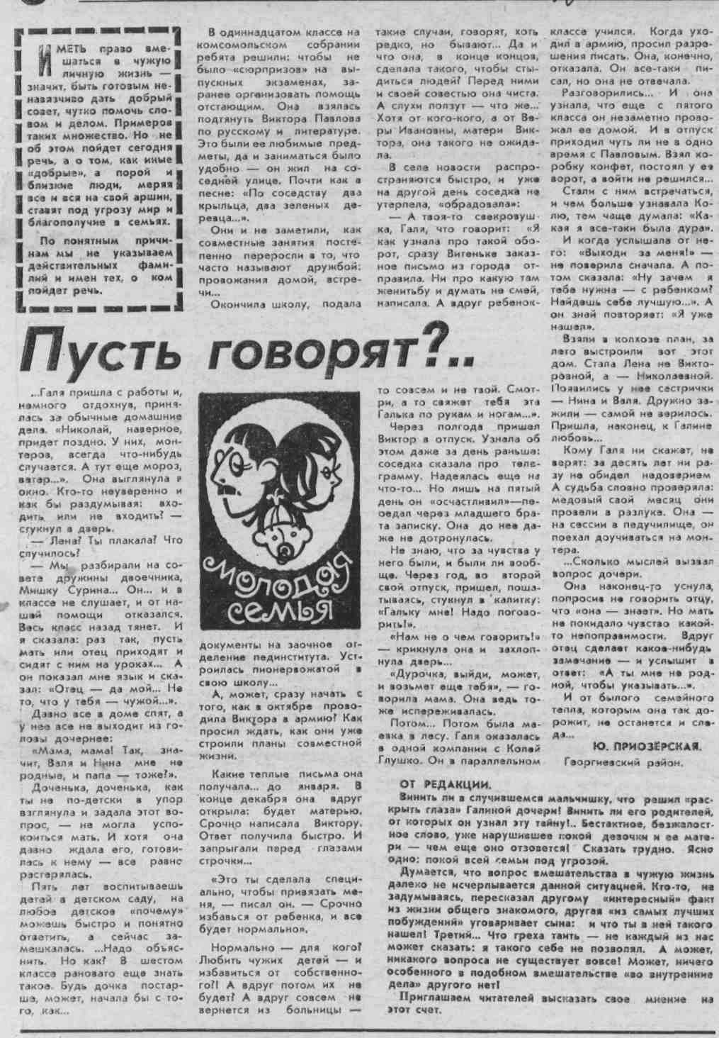Приозёрская, Ю. Пусть говорят? / Ю. Приозёрская // Молодой ленинец. – 1979. – 13 апр. – С.4. – (Молодая семья).