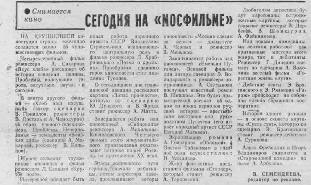 Семедяева, В. Сегодня на «Мосфильме» / В. Семедяева // Молодой ленинец. – 1979. – 17 апр. – С.4. – (Снимается кино).
