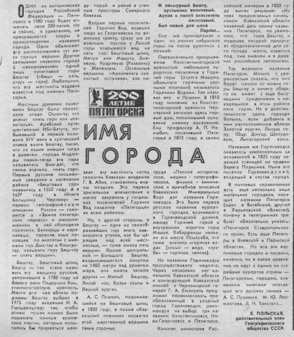 Польская, Е. Имя города / Е. Польская // Молодой ленинец. – 1979. – 20 апр. – С.4. – (200 лет Пятигорска).
