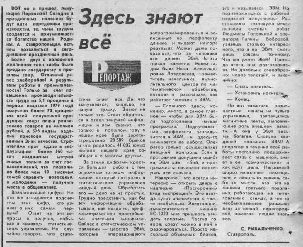 Рыбальченко, С. Здесь знают всё / С. Рыбальченко // Молодой ленинец. – 1979. – 1 мая. – С.4. – (Репортаж).