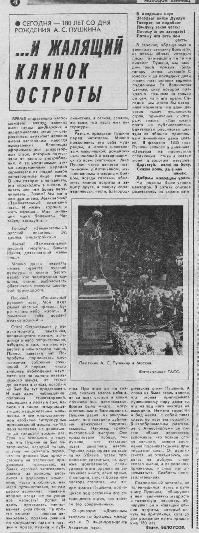 Белоусов, В. ...И жалящий клинок остроты / В. Белоусов // Молодой ленинец. – 1979. – 6 июня.– С.4. – (Сегодня - 180 лет со дня рождения А.С. Пушкина).