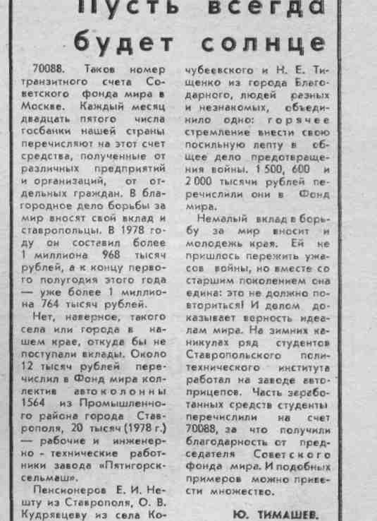 Тимашев, Ю. Пусть всегда будет солнце / Ю. Тимашев // Молодой ленинец. – 1979. – 22 июня.– С.3.