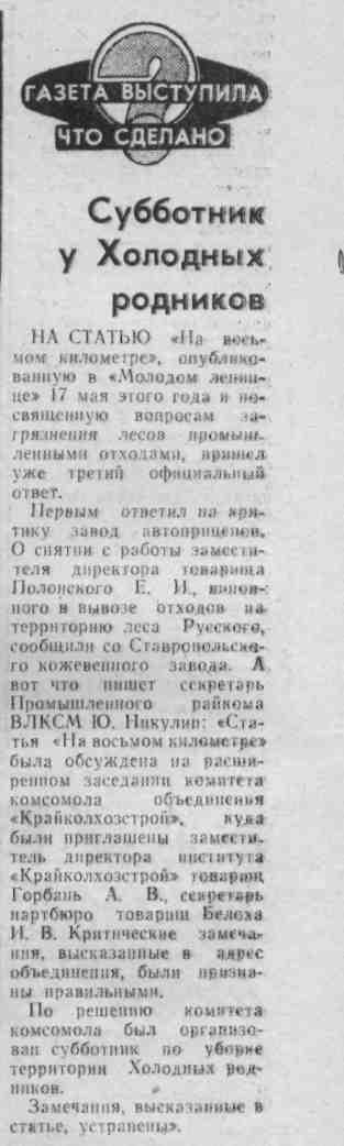 Субботник у Холодных родников // Молодой ленинец. – 1979. – 24 июля. – С.3.