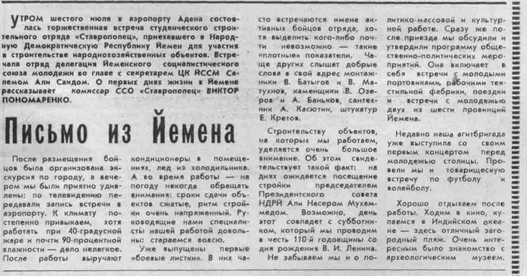 Письмо из Йемена // Молодой ленинец. – 1979. – 27 июля. – С.3.