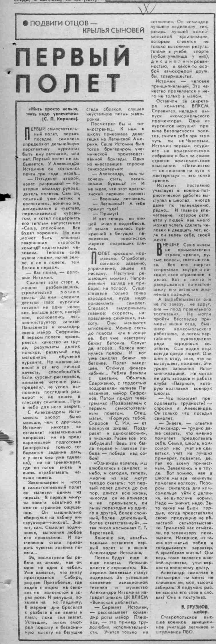 Грузков, В. Первый полет / В. Грузков // Молодой ленинец. – 1979. – 4 авг. – С.3. - (Подвиги отцов – крылья сыновей).