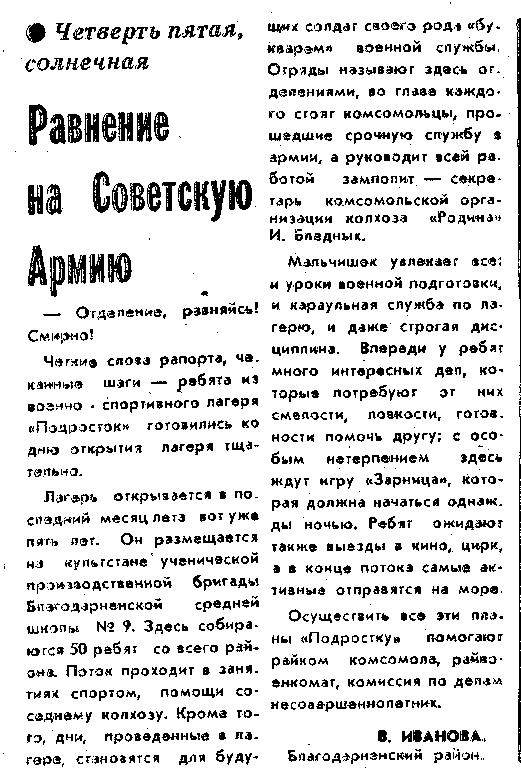 Иванова, В. Равнение на Советскую армию / В. Иванова // Молодой ленинец. – 1979. – 15 авг. – С.4. - (Четверть пятая, солнечная).