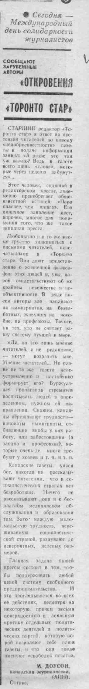 Доусон, М. «Откровения «Торонто стар» / М. Доусон // Молодой ленинец. – 1979. – 8 сент.– С.3. - (Сегодня международный день солидарности журналистов).