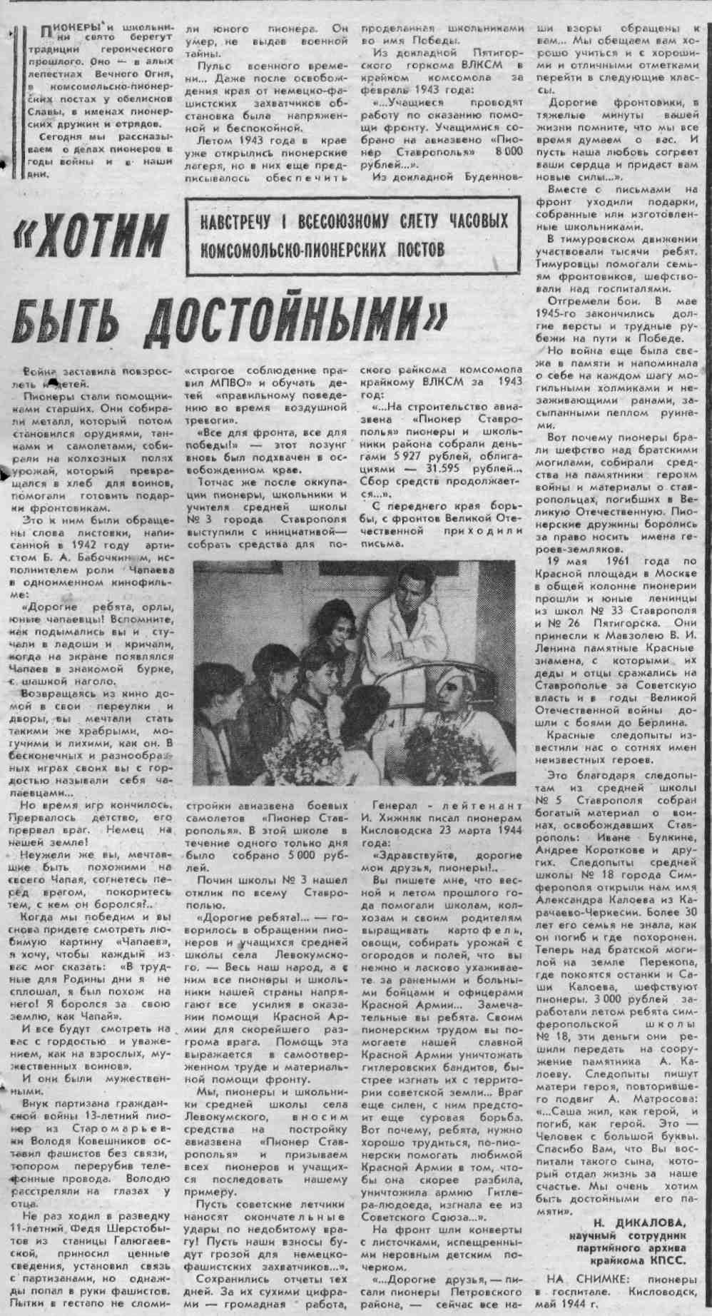 Дикалова, Н. «Хотим быть достойными» / Н. Дикалова // Молодой ленинец. – 1979. – 12 сент.– С.3. - (Всероссийский слет часовых постов).