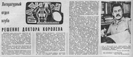 Белоусов, В. Решение доктора Королева / В. Белоусов // Молодой ленинец. – 1979. – 25 сент.– С.4. - (Литературный отдел клуба).