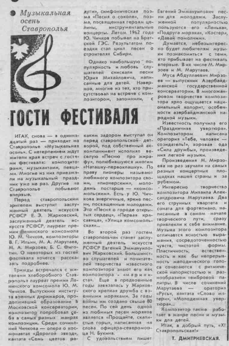 Дмитриевская, Т. Гости фестиваля / Т. Дмитриевская // Молодой ленинец. – 1979. – 28 сент.– С.4. - (Музыкальная осень Ставрополья).
