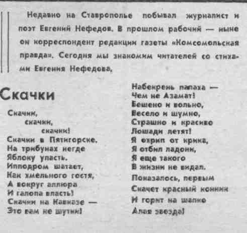 Нефедов, Е. Скачки : [стихотворение] / Е. Нефедов // Молодой ленинец. – 1979. – 20 окт.– С.3.