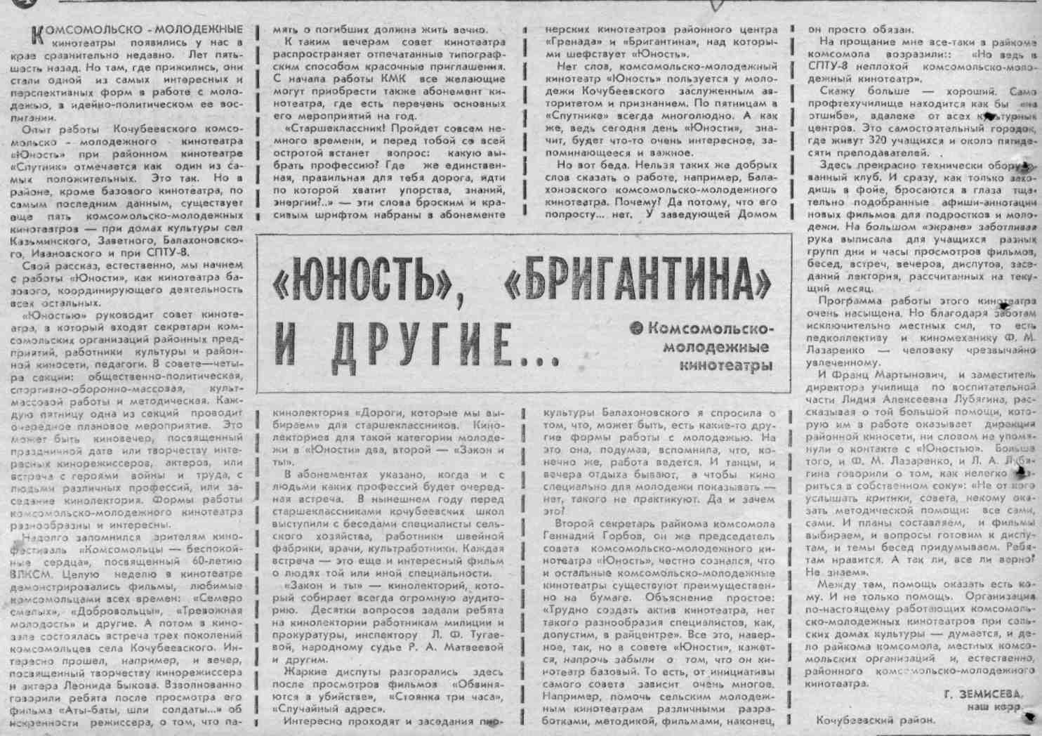 Земисева, Г. «Юность», «Бригантина» и другие / Г. Земисева // Молодой ленинец. – 1979. – 25 окт.– С.4. – (Комсомольско–молодежные кинотеатры).