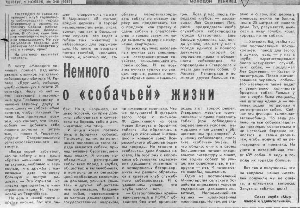 Немного о «собачьей» жизни // Молодой ленинец. – 1979. – 1 нояб.– С.3. - (О клубе собаководства).