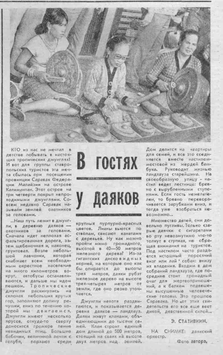 Стативкин, Э. В гостях у даяков / Э. Стативкин // Молодой ленинец. – 1979. – 15 нояб.– С.3. - (Музыка).