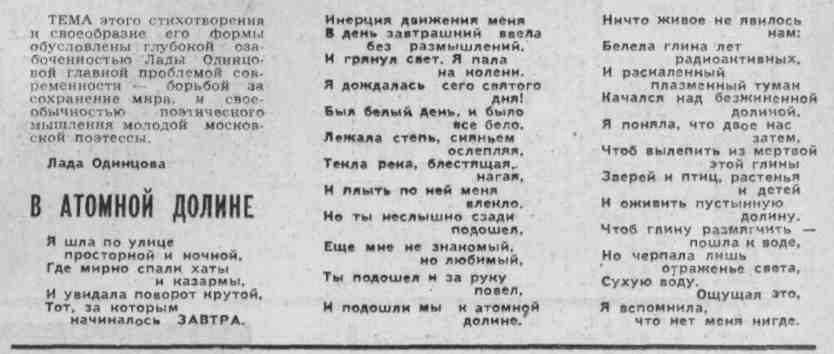 Одинцова, Л. В атомной долине : [стихотворение] / Л. Одинцова // Молодой ленинец. – 1979. – 24 нояб.– С.3.