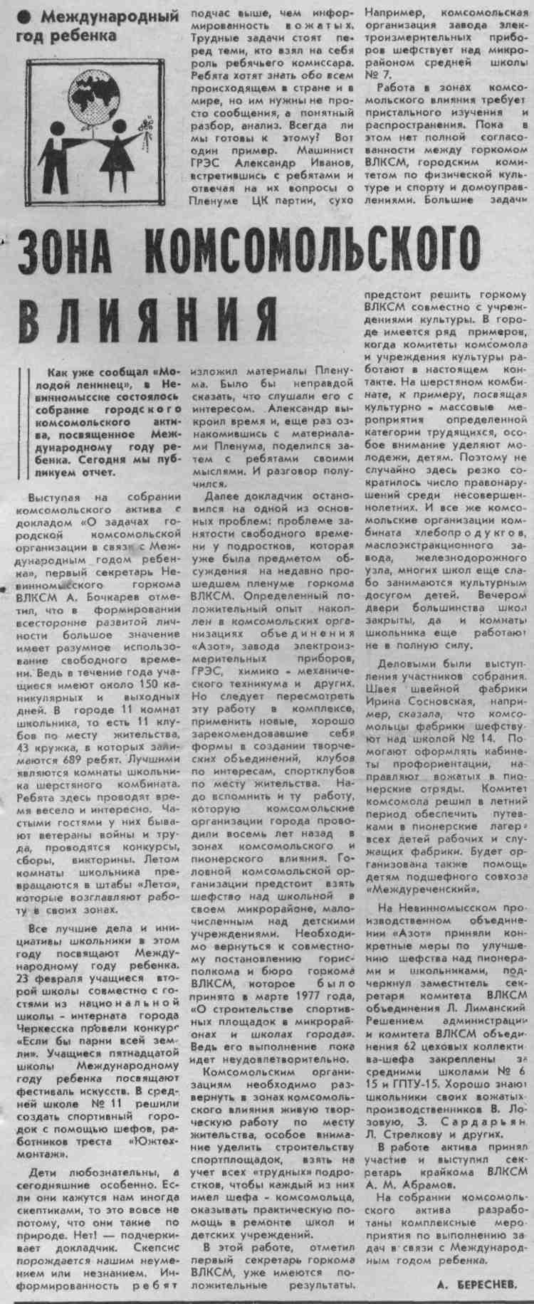 Береснев, А. Зона комсомольского влияния / А. Береснев // Молодой ленинец. – 1979. – 4 апр. – С.3. – (Международный год ребенка).