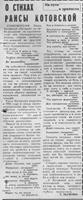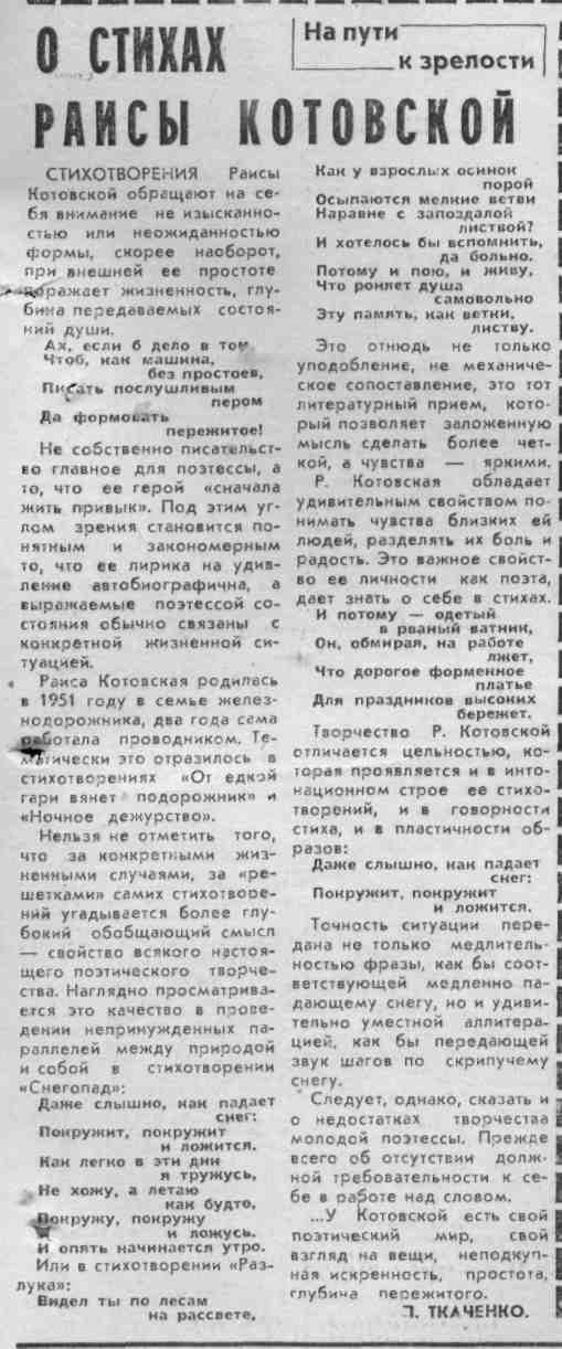 Ткаченко, Л. О стихах Раисы Котовской / Л. Ткаченко // Молодой ленинец. – 1979. – 7 апр. – С.3. – (На пути к зрелости).