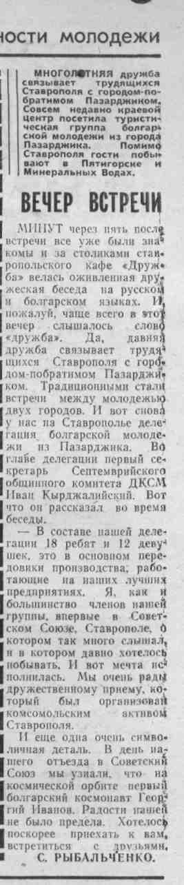 Рыбальченко, С. Вечер встречи / С. Рыбальченко // Молодой ленинец. – 1979. – 24 апр. – С.3. – (Сегодня – Международный день солидарности молодежи).