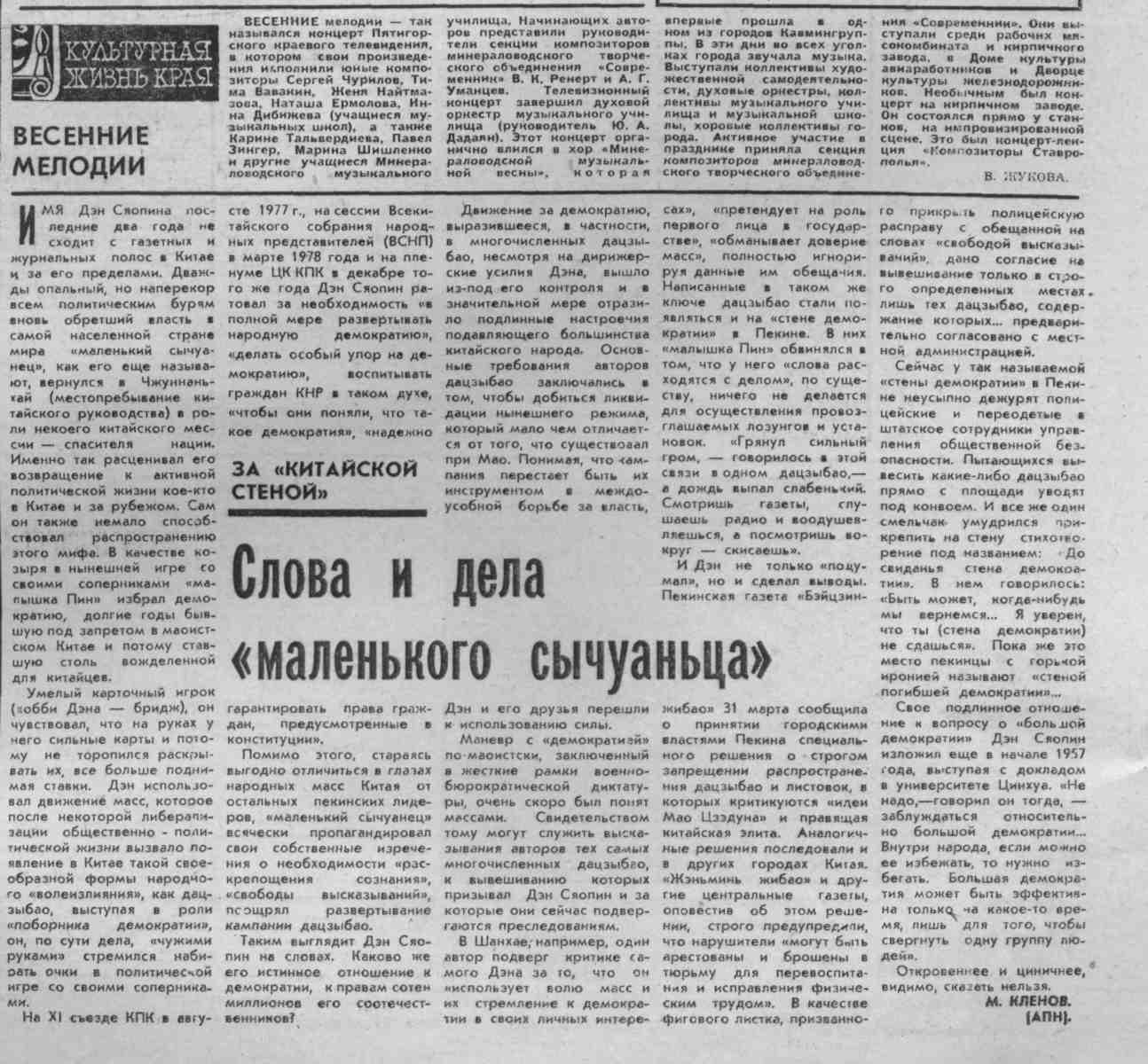 Кленов, М. Слова и дела «маленького сычуаньца» / М. Кленов // Молодой ленинец. – 1979. – 13 июня.– С.3. – (За «китайской стеной»).