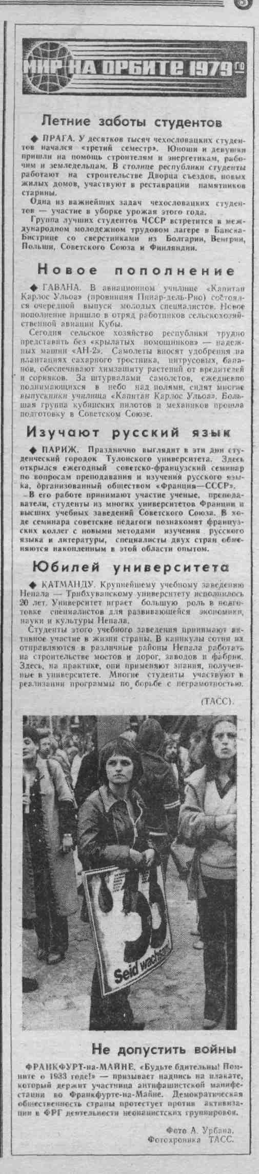 Летние заботы студентов // Молодой ленинец. – 1979. – 13 июля. – С.3. - (Мир на орбите 1979-го).