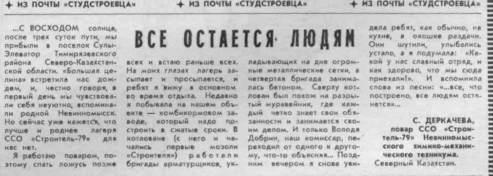 Деркачева, С. Все остается людям / С. Деркачева // Молодой ленинец. – 1979. – 27 июля. – С.3. - (Из почты).