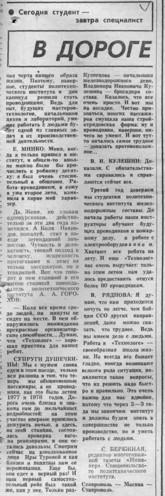 Бережная, С. В дороге / С. Бережная // Молодой ленинец. – 1979. – 27 июля. – С.3. - (Сегодня студент – завтра специалист).
