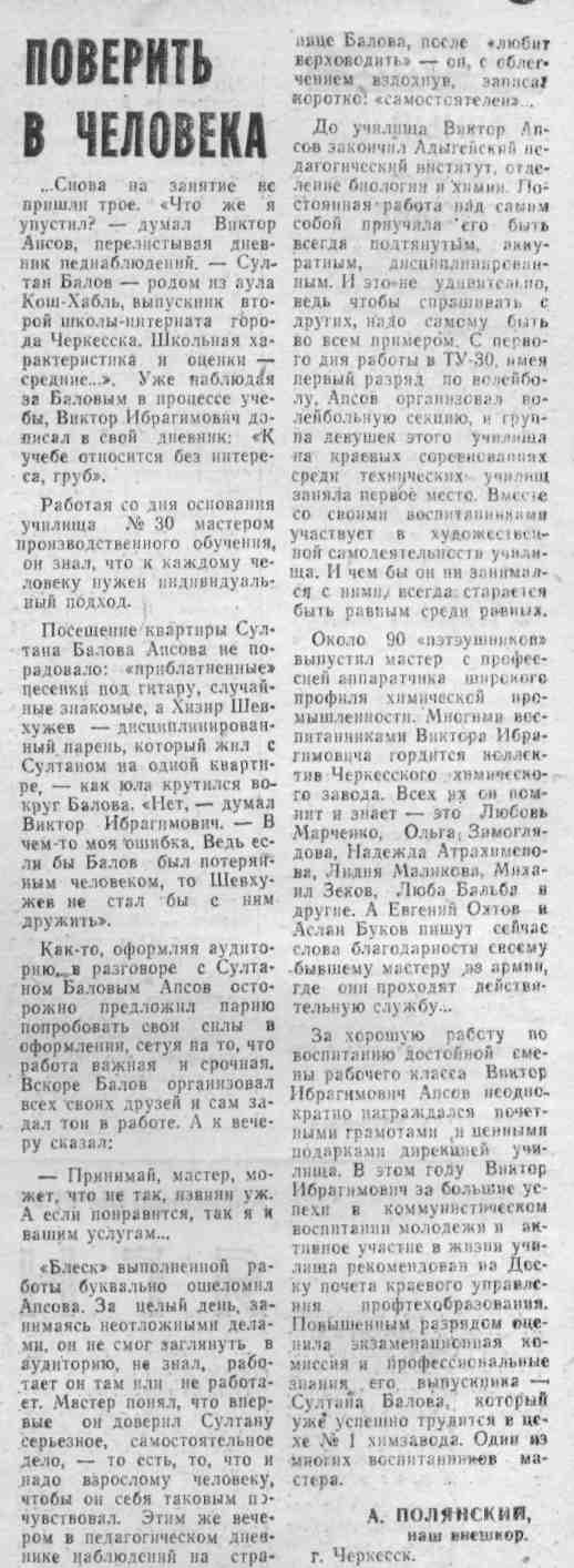 Полянский, А. Поверить в человека / А. Полянский // Молодой ленинец. – 1979. – 14 авг. – С.3. - (Путь в профессию).
