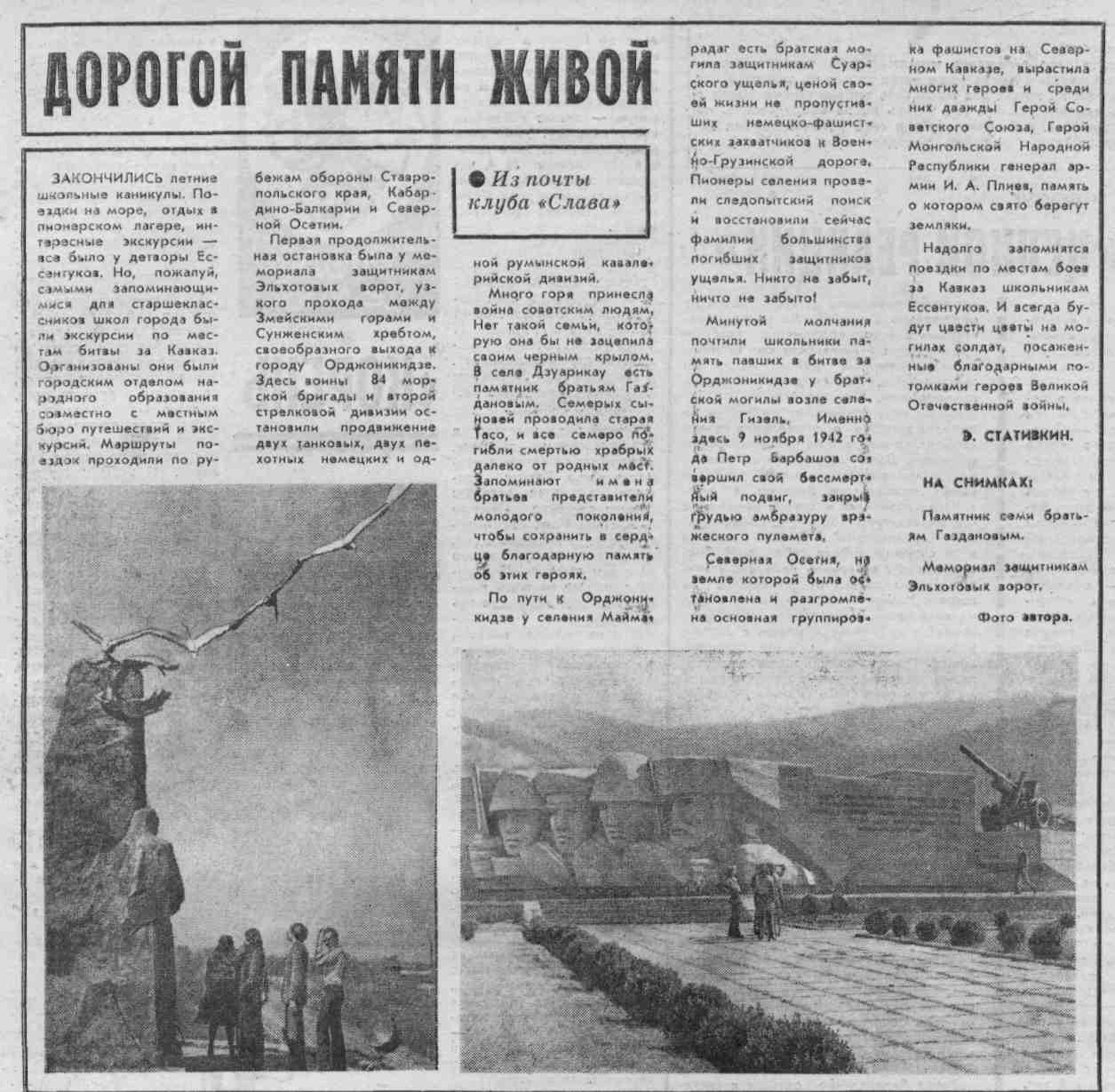 Стативкин, Э. Дорогой памяти живой / Э. Стативкин // Молодой ленинец. – 1979. – 5 сент. – С.4. - (Из почты клуба «Слава»).